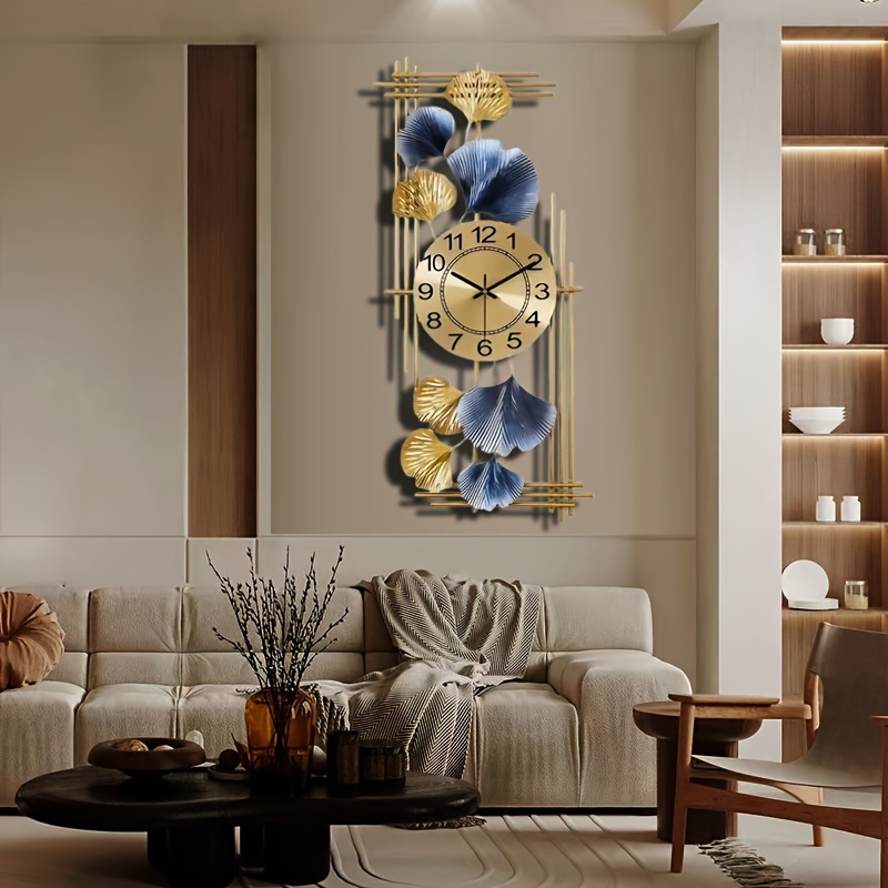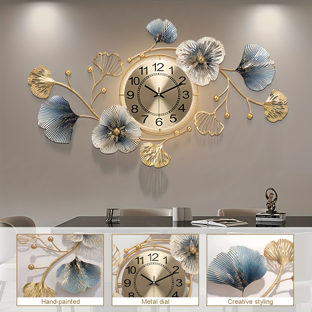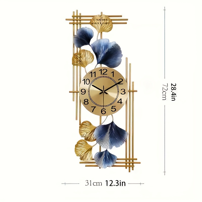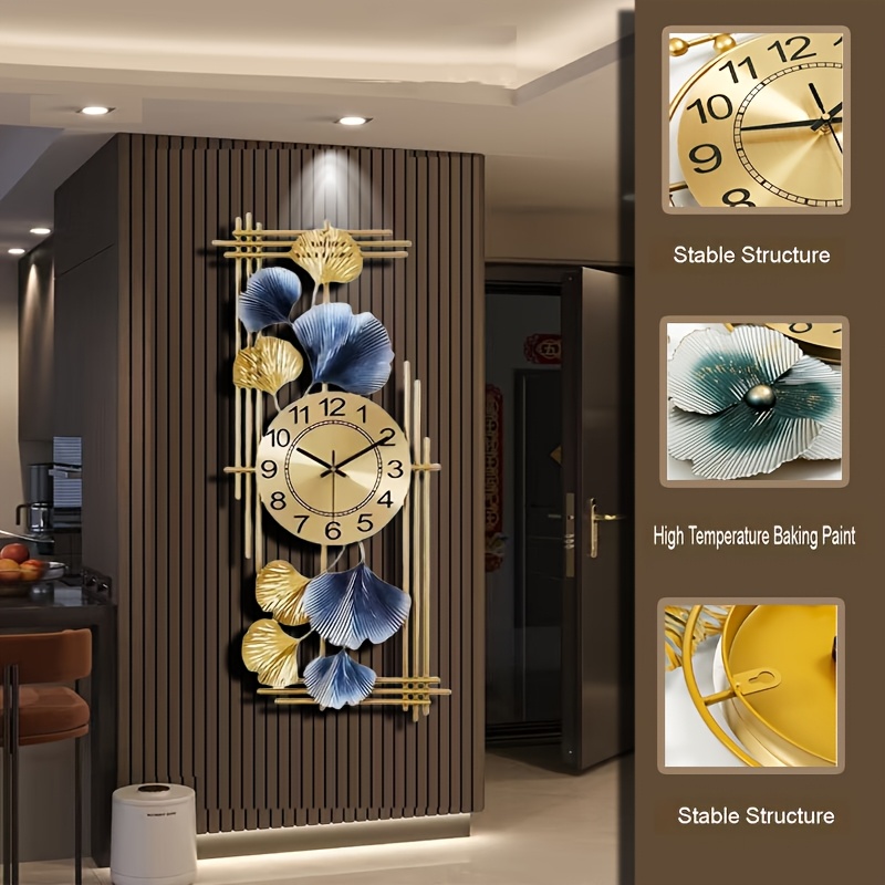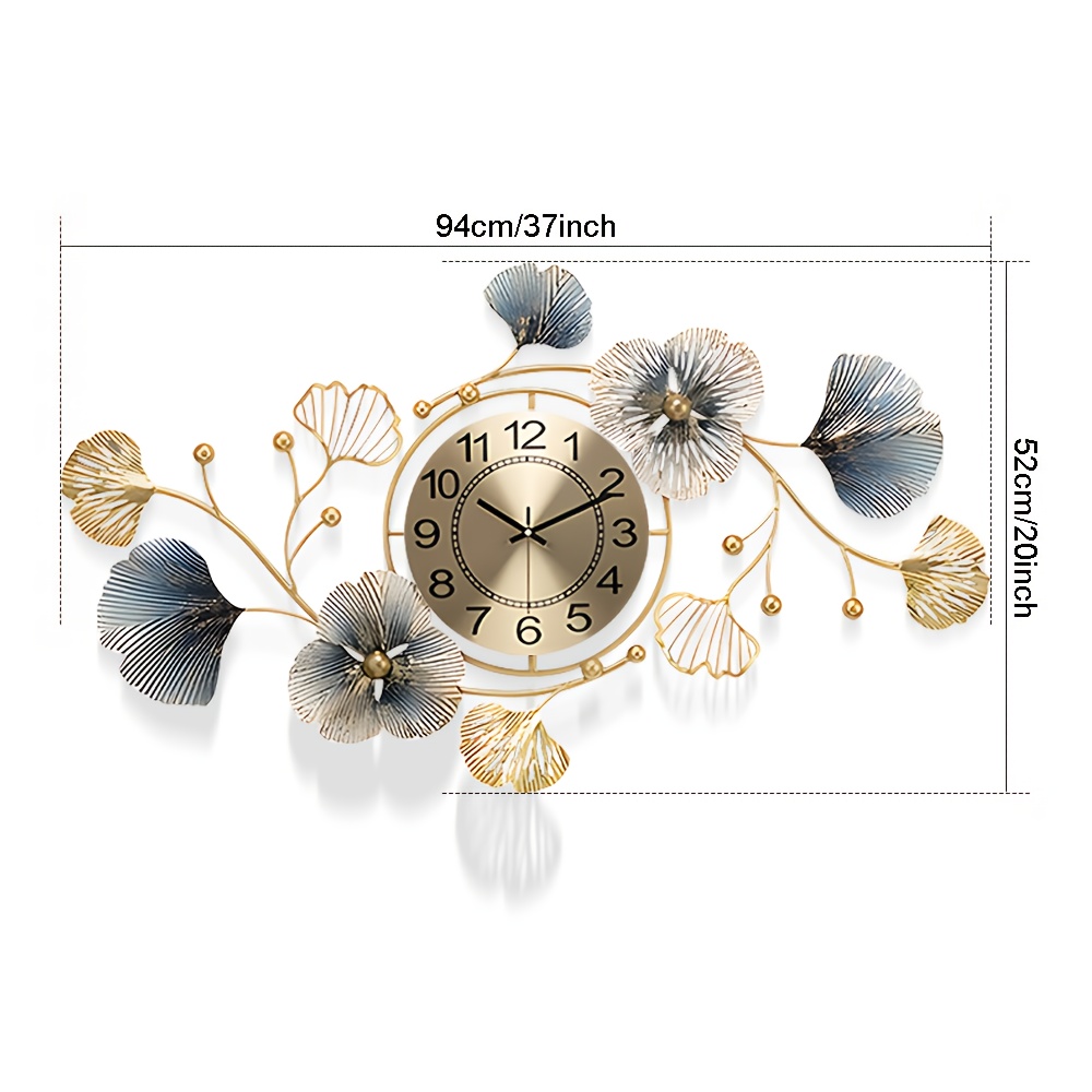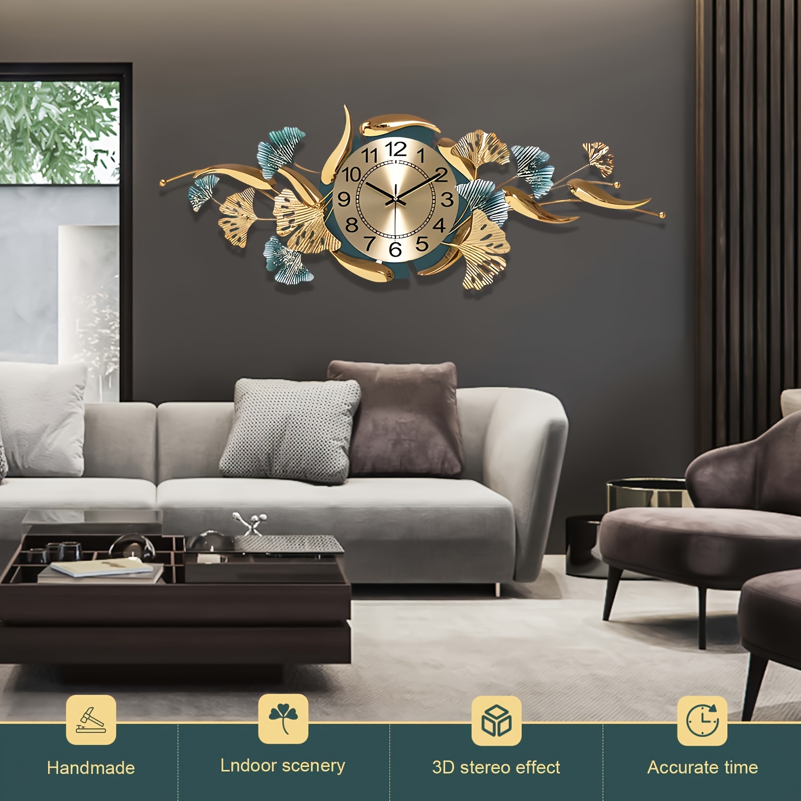 Large Modern Minimalist Ginkgo Leaf Wall Clock - Silent Non-Ticking Digital Clock with Golden Hands & Black stripes, Battery-Free